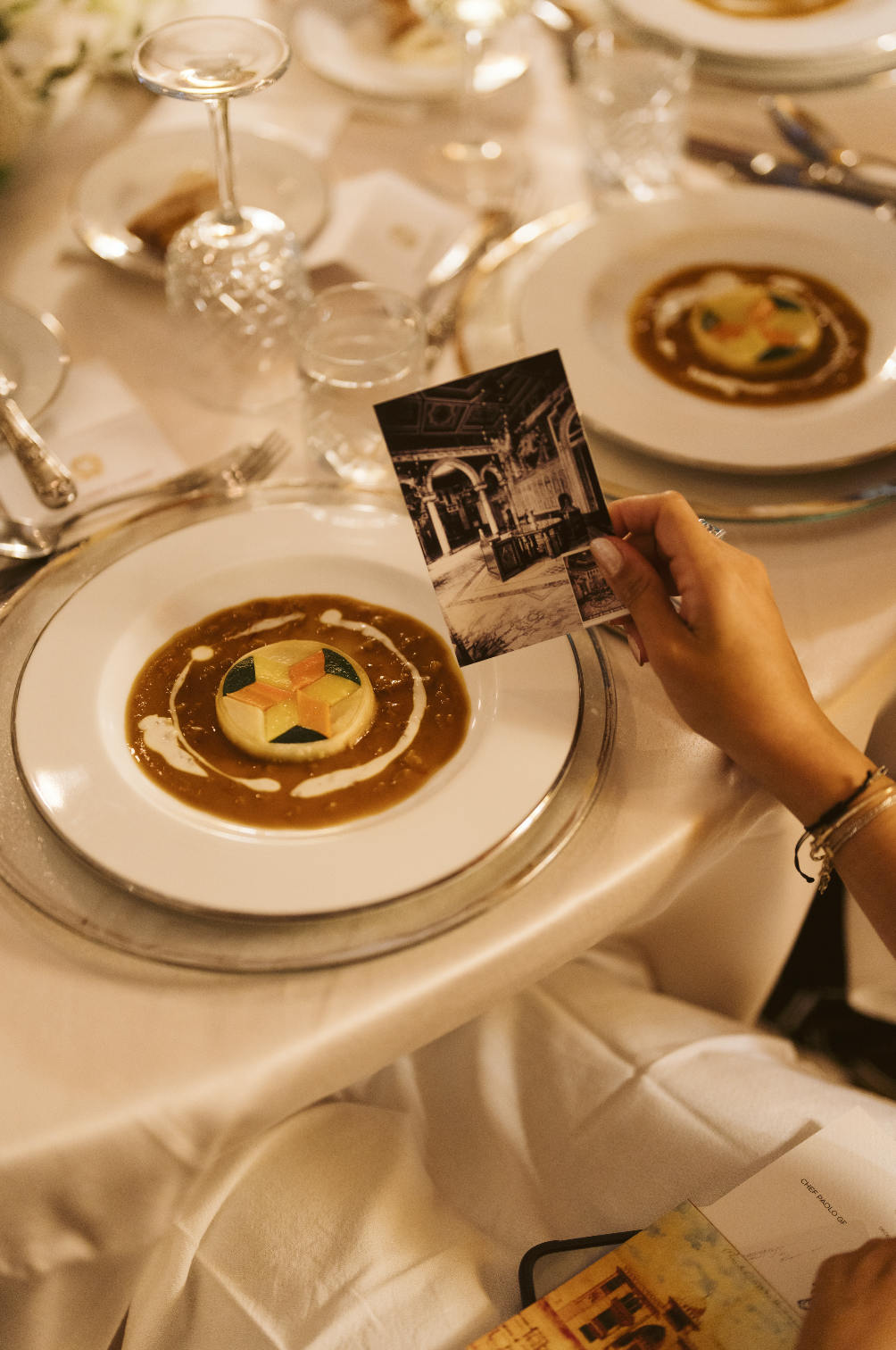 We started with Griffa’s mosaic of root vegetables inspired by the interior décor of the Byzantine hall at Abdeen Palace, which was designed by Ernesto Verucci. The vegetable tagine was intricately assembled to resemble the arabesque patterns recurrent within the palace, home to Egypt’s ruling monarchs until 1952. Pairing it with a fragrant mint lassi and an aromatic couscous evoked the delicate balance of warm and bright flavors found across both Italian and Egyptian cuisines. While both cuisines lean on hearty vegetables year-round, even during the hottest months, fresh herbs are a staple of every meal; these aromatic greens lend brightness and zest to balance out the warmth of the spices and the richness of the sauces.