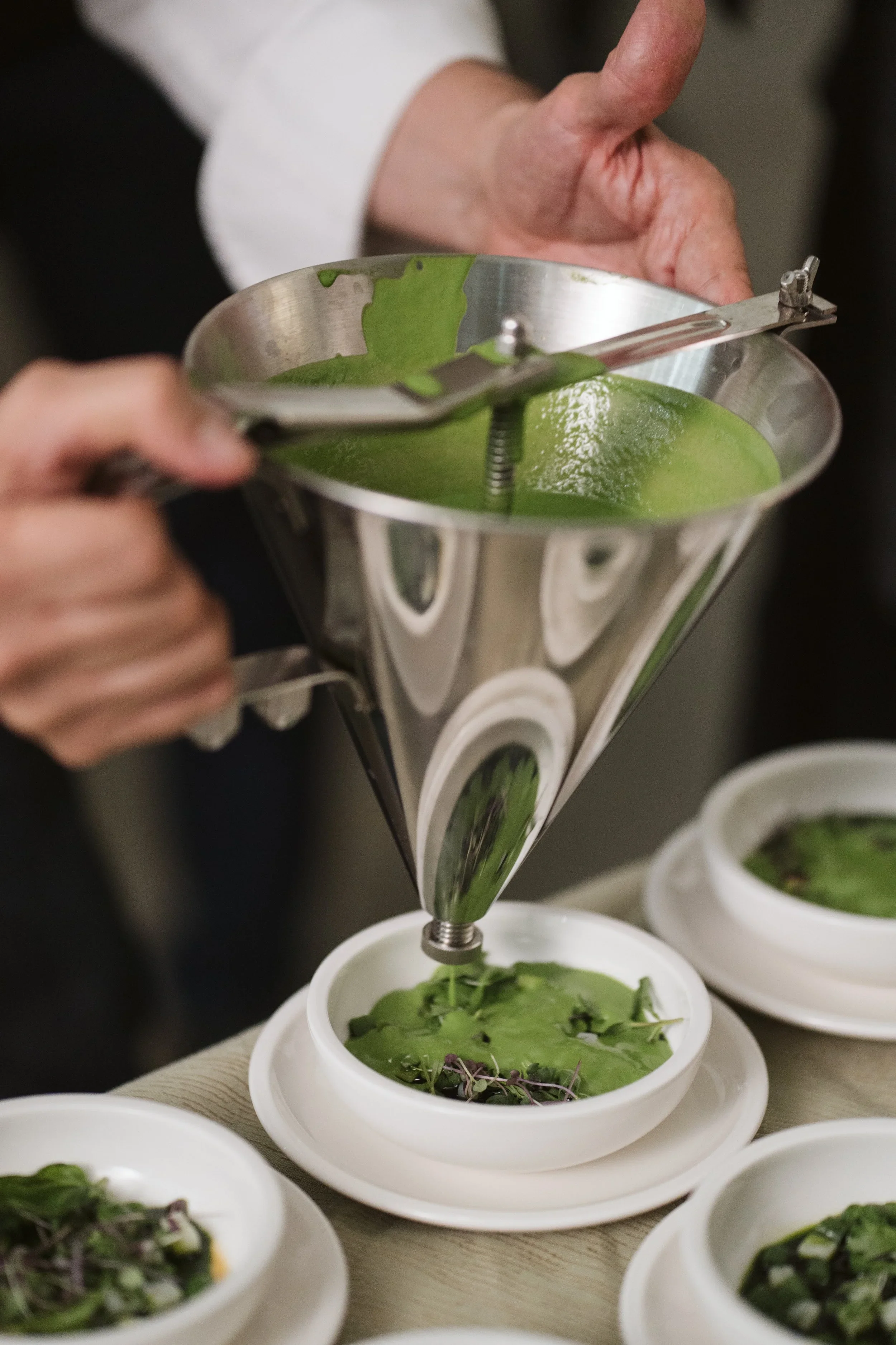 The first course is served: ‘Pasta al Pesto in Abstract,’ which, in his words, is a marriage between a mistake and an experiment. Ten years ago, one of Bottura’s chefs mistakenly overcooked 7 kg of pasta. But instead of tossing them out, he asked if he could turn them into a creamy miso-like paste that could be repurposed later, and according to Bottura, “it was so sweet and full of life that we had to do something with it.” The resulting dish — which included toasted pine nuts, string beans, crunchy potatoes, olive oil and fresh basil — pays tribute to traditional pesto but finds its inspiration in miso, which is quintessentially Japanese.