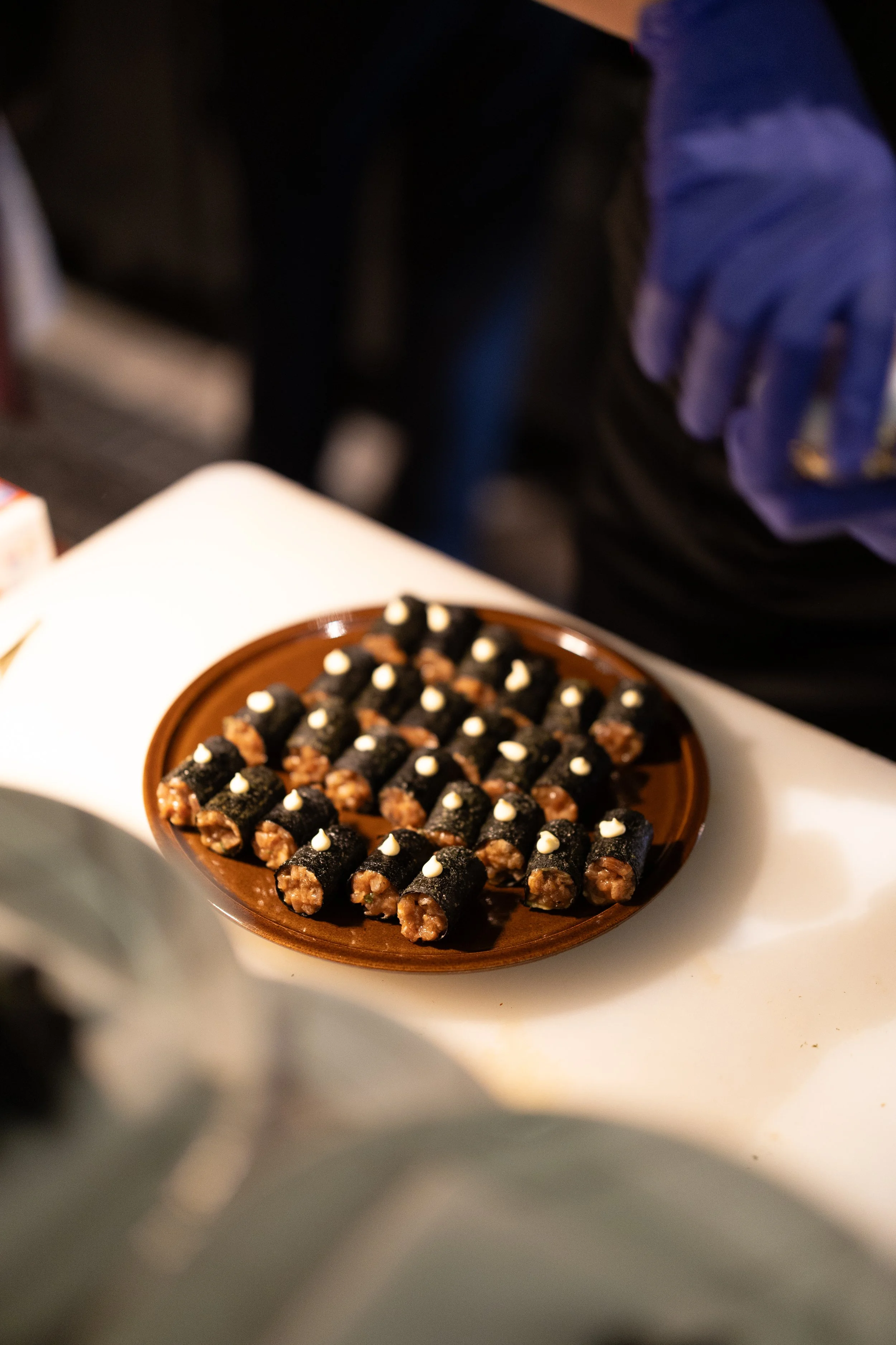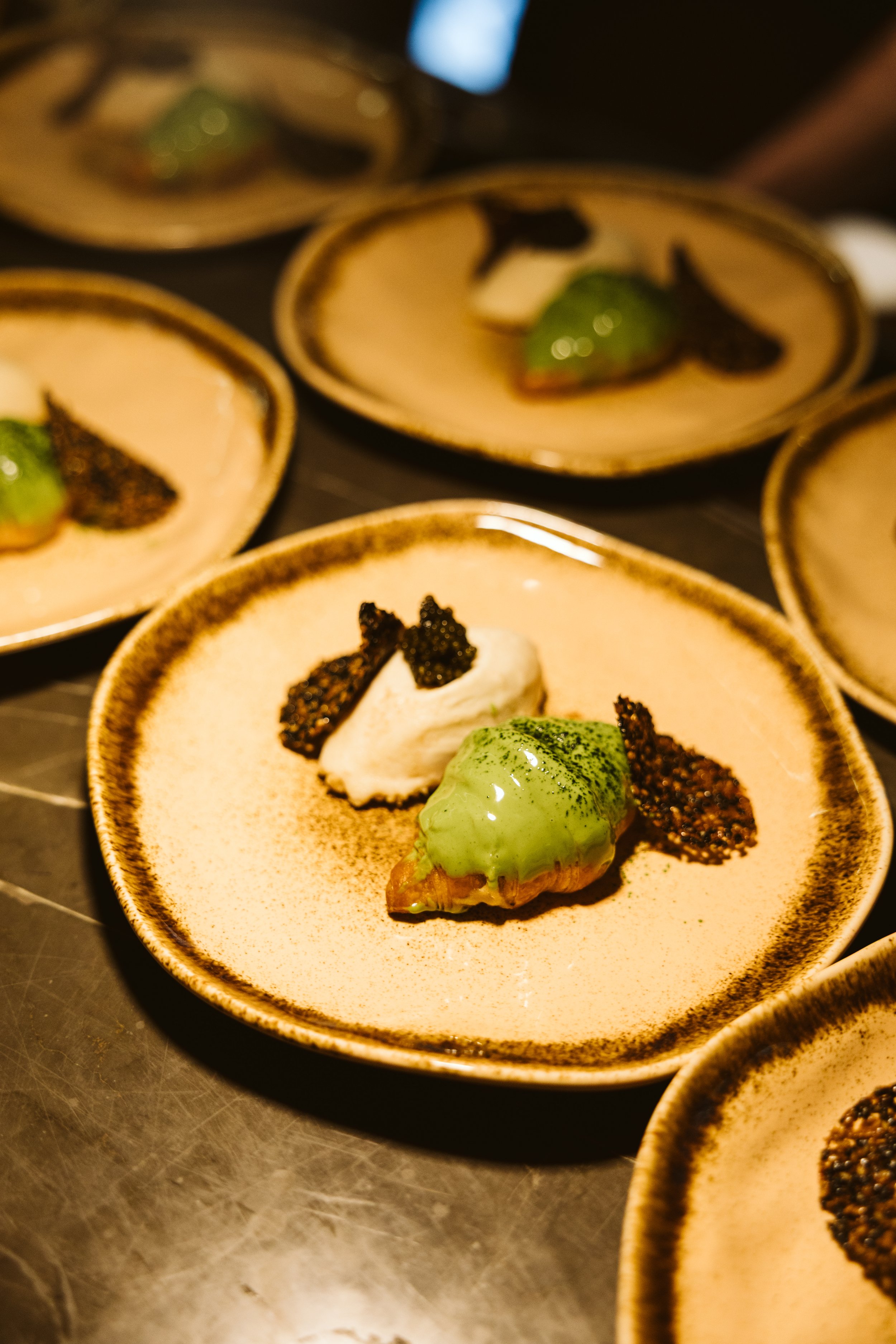 The rhythm continued as Chef Ali returned with a bright, textural Smashed Aka-Ebi, pairing crisp ebi tempura with the citrusy spark of a yuzu dressing. Chef Reif followed with a dish of profound richness: Angus Beef Gyoza, its thin, pan-seared skin yielding to a filling of succulent wagyu ribeye and the earthy perfume of truffle. The evening’s undisputed masterwork came next, a dish that embodied Chef Reif’s pursuit of perfection: the Baked Fork Mashed Salmon. The result of a painstaking 60-hour cure and an overnight slow cook, the salmon arrived with a texture so silken it defied belief, napped in a delicate Japanese curry beurre blanc. For the final savory act, Reif presented Braised Wagyu Short Ribs glazed in a sweet and savory gochujang miso. The dinner concluded with an audacious stroke of genius: a Matcha Croissant filled with a toasted rice-inflected genmaicha cremeux, its bitter and sweet notes shockingly, brilliantly punctuated by the saline pop of caviar.